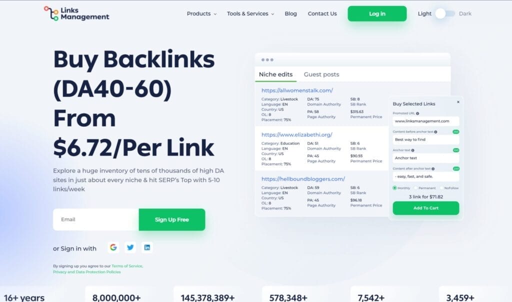 LinksManagement is a large backlink marketplace that allows users to buy links directly from an extensive catalog of websites across various niches, domain authorities, and price ranges. Known for its sheer volume of options and flexible filtering tools, LinksManagement is ideal for businesses and agencies that want full control over their link-building strategy.
