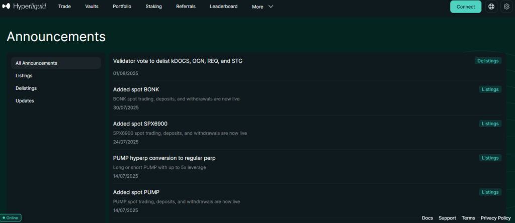 To further safeguard users, Hyperliquid integrates advanced risk management tools such as automated liquidation systems and real-time monitoring of open positions, reducing systemic risks during high volatility. The platform is also built with a highly efficient matching engine and robust infrastructure to prevent downtime or manipulation. Importantly, Hyperliquid has never faced a major hack or compromise, which strengthens its reputation as a secure DeFi derivatives exchange.