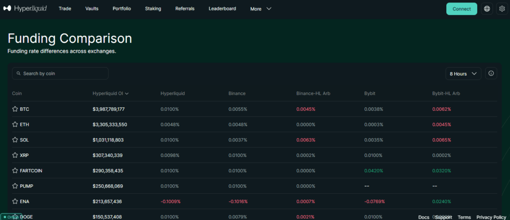 - Funding Rates: Vary by market; visible in real-time with comparisons to Binance, OKX, etc.
