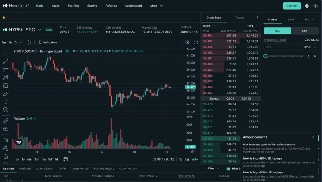 Hyperliquid is a high-performance perpetuals DEX built on its own purpose-built L1, designed to feel like a CEX while staying fully on-chain. The app-chain architecture keeps blockspace focused on trading, enabling fast finality, deep order books, and low fees. If you want pro-grade tooling (advanced order types, risk controls) plus a steady cadence of new perp markets and a path for builders to launch niche pairs, Hyperliquid is the “speed + transparency” pick.