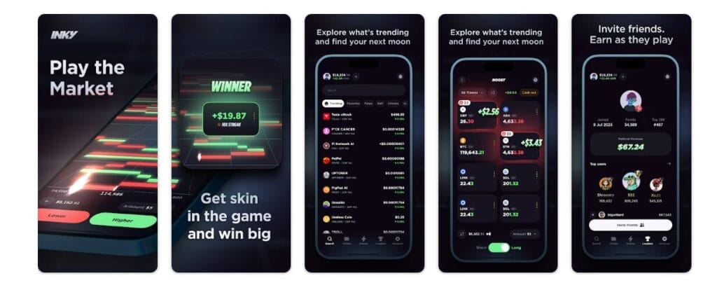 According to app store descriptions, Inky includes gameplay-like features such as streaks, points for trading activity, and even candle prediction challenges that blend social mechanics with real markets.
