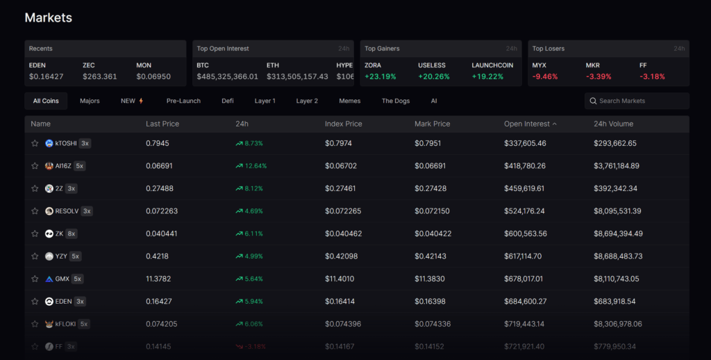 The Markets section serves as the main hub for trading activity. It displays real-time market data, available trading pairs, price movements, and liquidity depth. Through this tool, users can monitor live order books, open positions, and funding rates—enabling informed trading decisions with speed and precision similar to centralized exchanges.