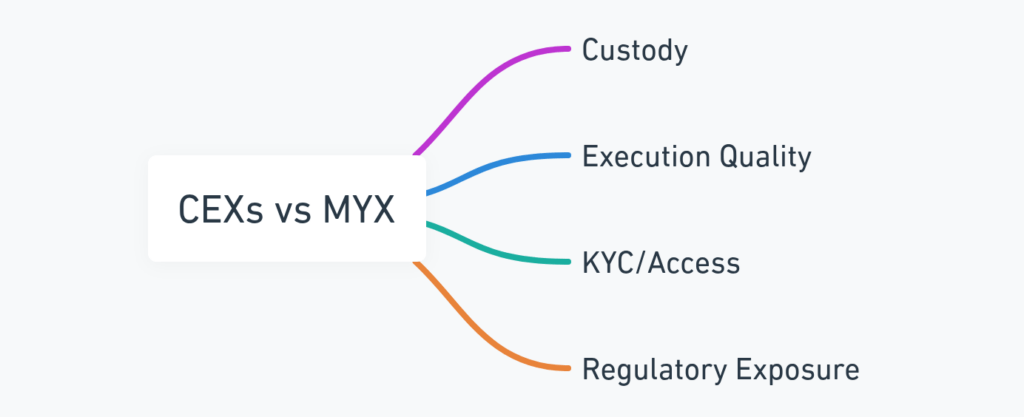 CEX comparison: CEXs offer deep books, low latency, and tight spreads, but require trust and KYC. MYX tries to deliver similar execution quality via MPM without taking custody.