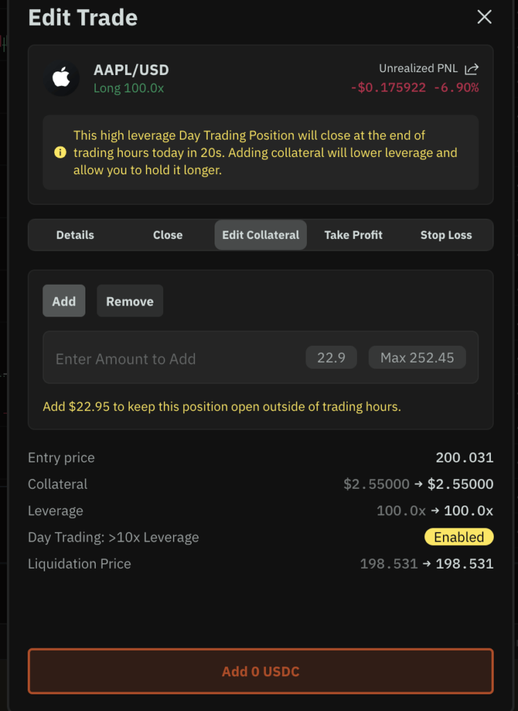 - Manage the position: Add/remove collateral, edit TP/SL, or partially close anytime (subject to market hours for RWAs).
