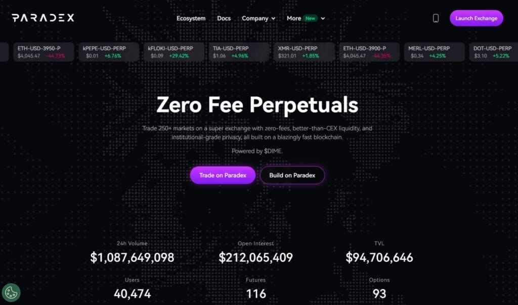 Paradex describes itself as a “super exchange built on a blazingly fast blockchain.” The platform merges the speed of centralized exchanges with the transparency of DeFi. It’s powered by $DIME, the native token of its L2 ecosystem, and is incubated by Paradigm, with backing from top trading firms such as Optiver, Akuna Capital, and Amber Group.