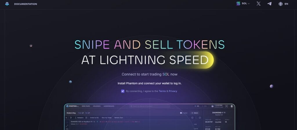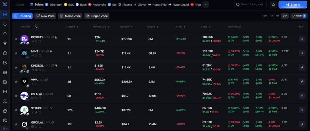 - What it shows first: new pairs and trending tokens with snipe oriented tools