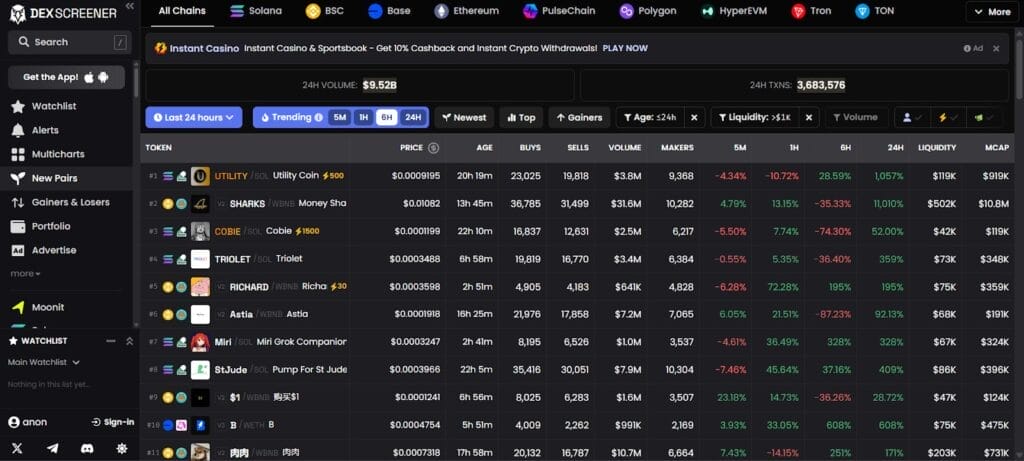 - What it shows first: new tokens and pairs across chains inside a trading terminal